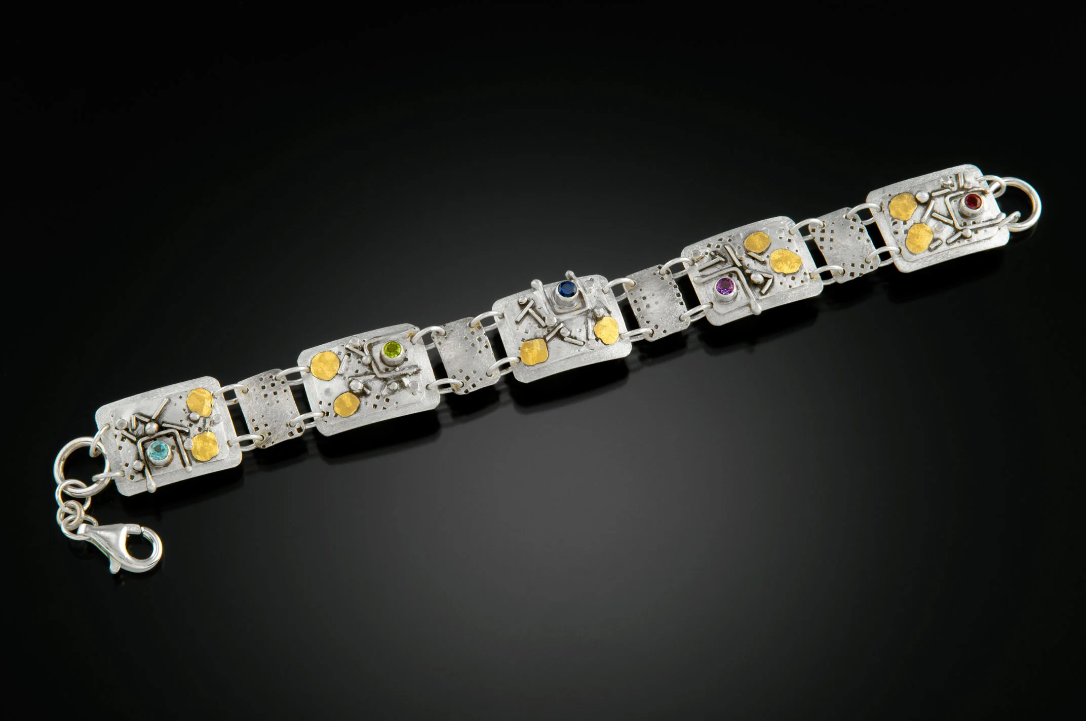 Sterling silver and 22K gold with Swiss blue topaz, peridot, sapphire, amethyst and rhodolite garnet
